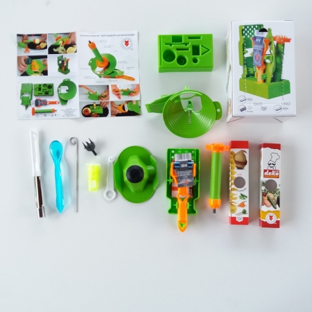 Setul se compune din mai multe piese:decojitor inimoare duo plus accesoriile care fac spaghete,decorator spiral,dop de lamaie,burghiu de cartofi,cotor de mar,o tija pentru cartofi spiralat si un accesoriu care se pune pe bormasina cand facem spirala din cartofi